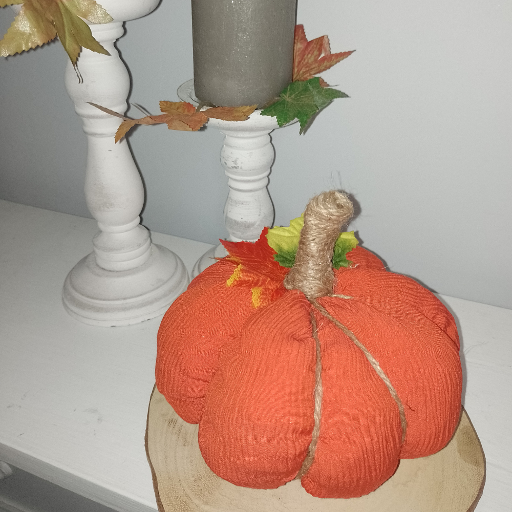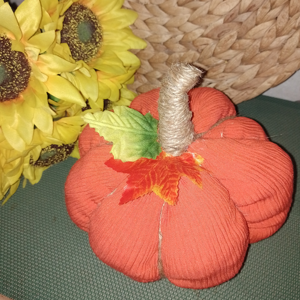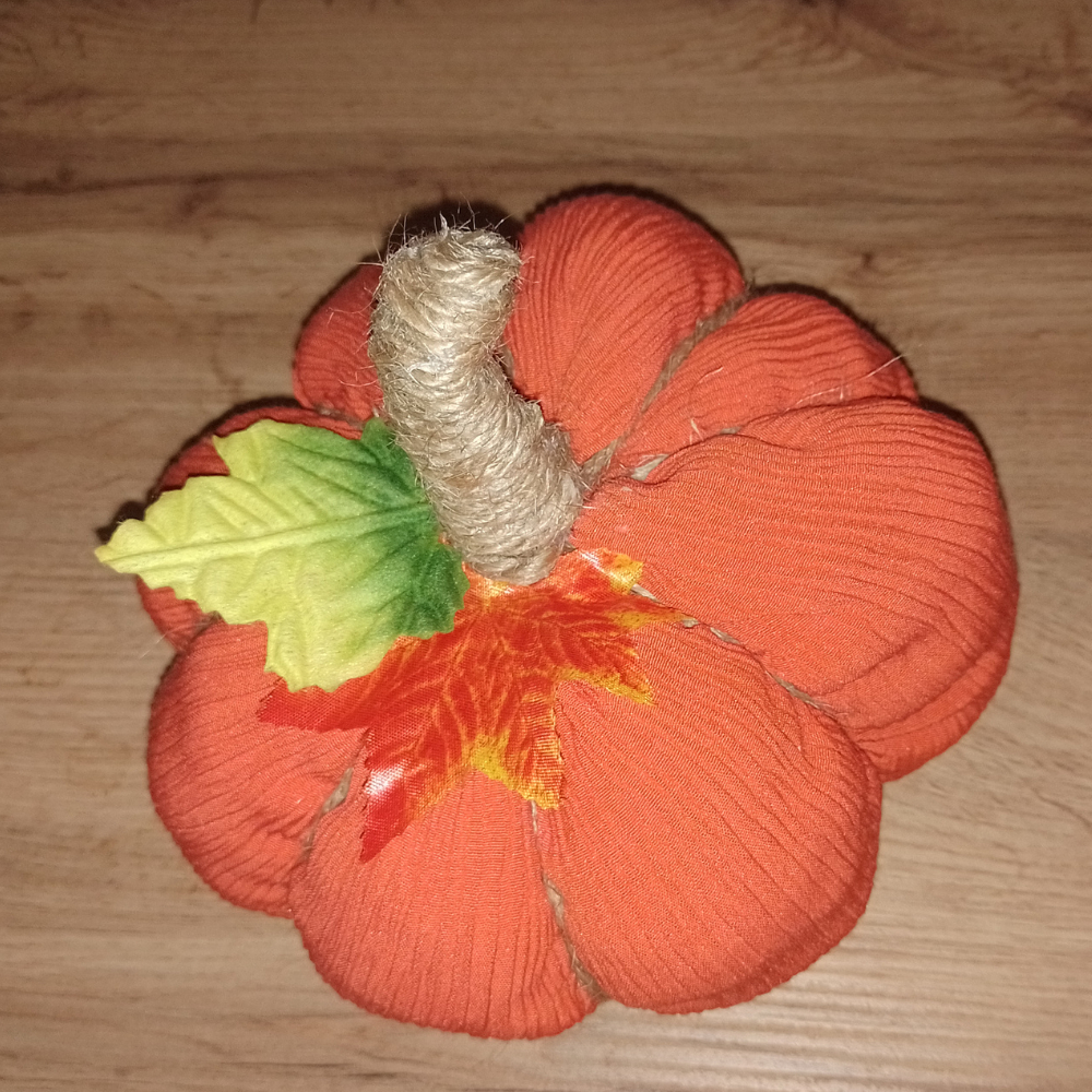 Внесете топлината на златната есен във вашия дом с тази ръчно изработена оранжева тиква от плат. Всеки детайл е създаден с внимание и усещане за уют – от меката текстура на плата, през естественото въже, оформящо дръжката, до фините декоративни листа, които добавят живост и цвят.