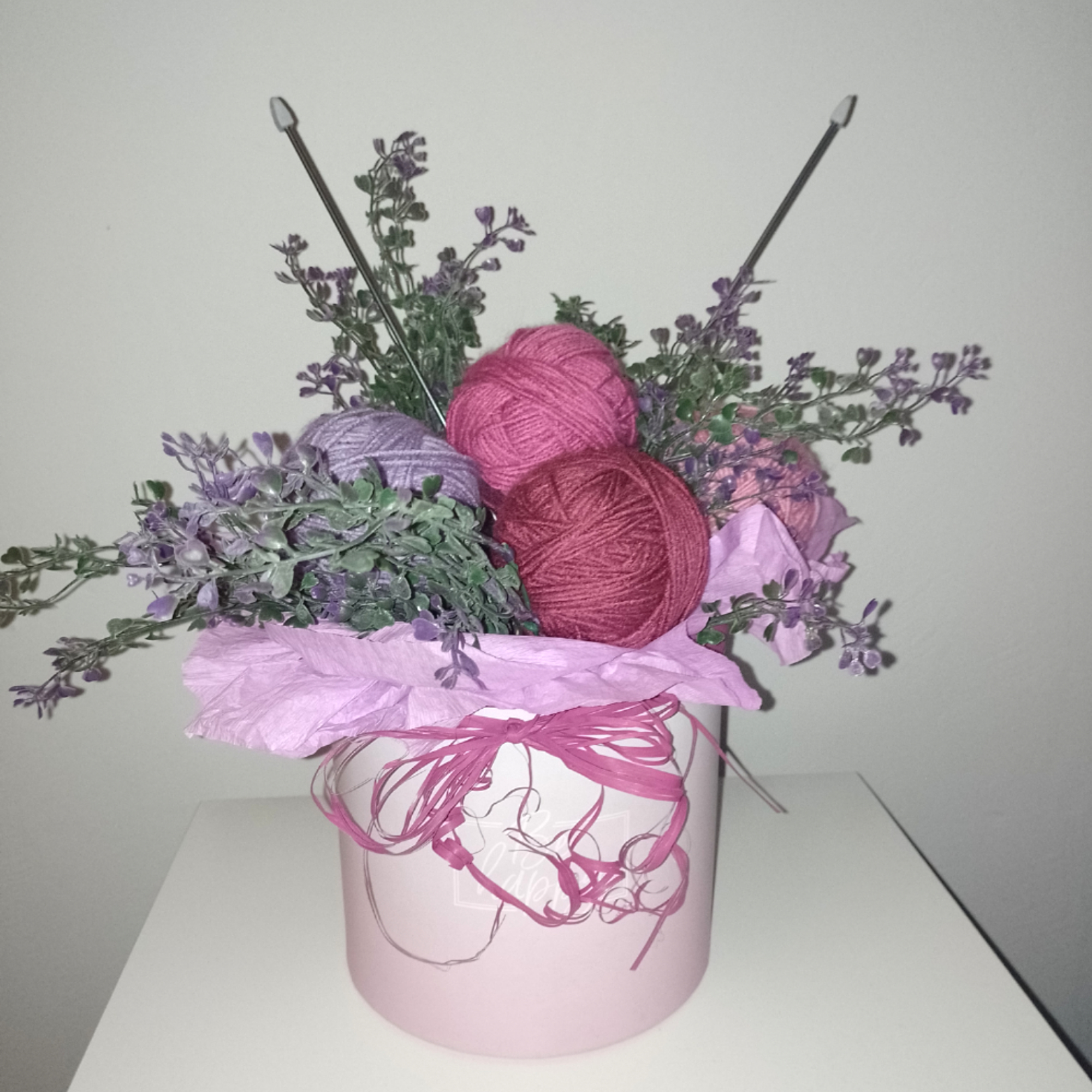 Съчетах нежни нюанси на розово и лилаво с декоративна зеленина, за да се получи усещане за мекота и хармония. В центъра подредих кълба прежда, а двете куки допълват композицията по естествен начин и подсказват за онези тихи моменти, посветени на творчество.