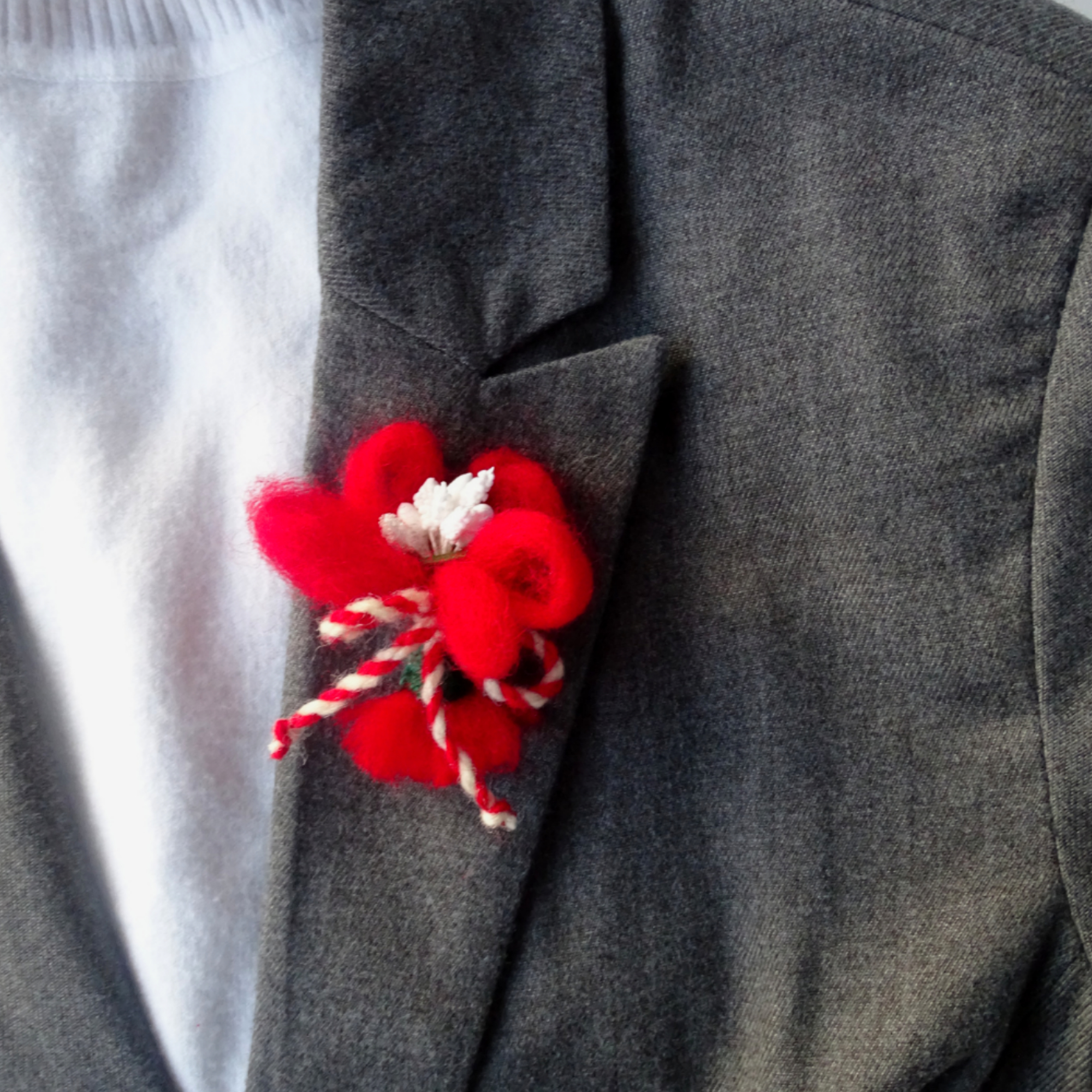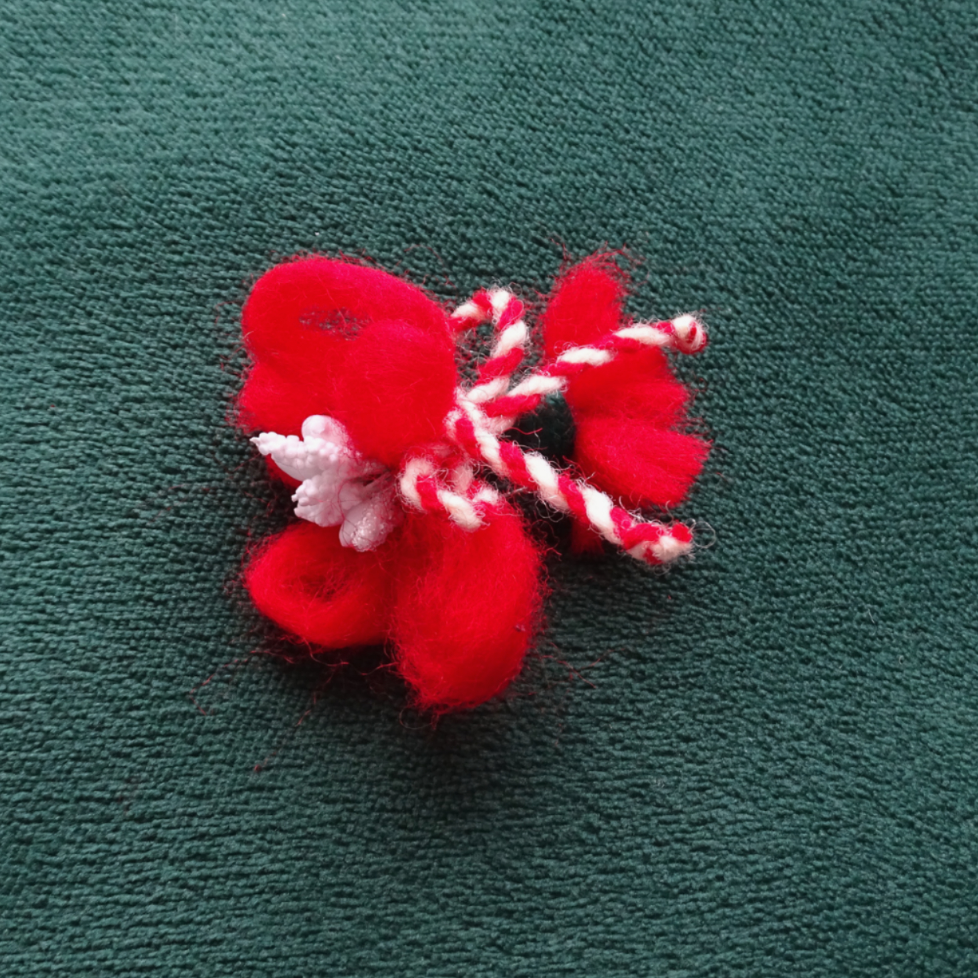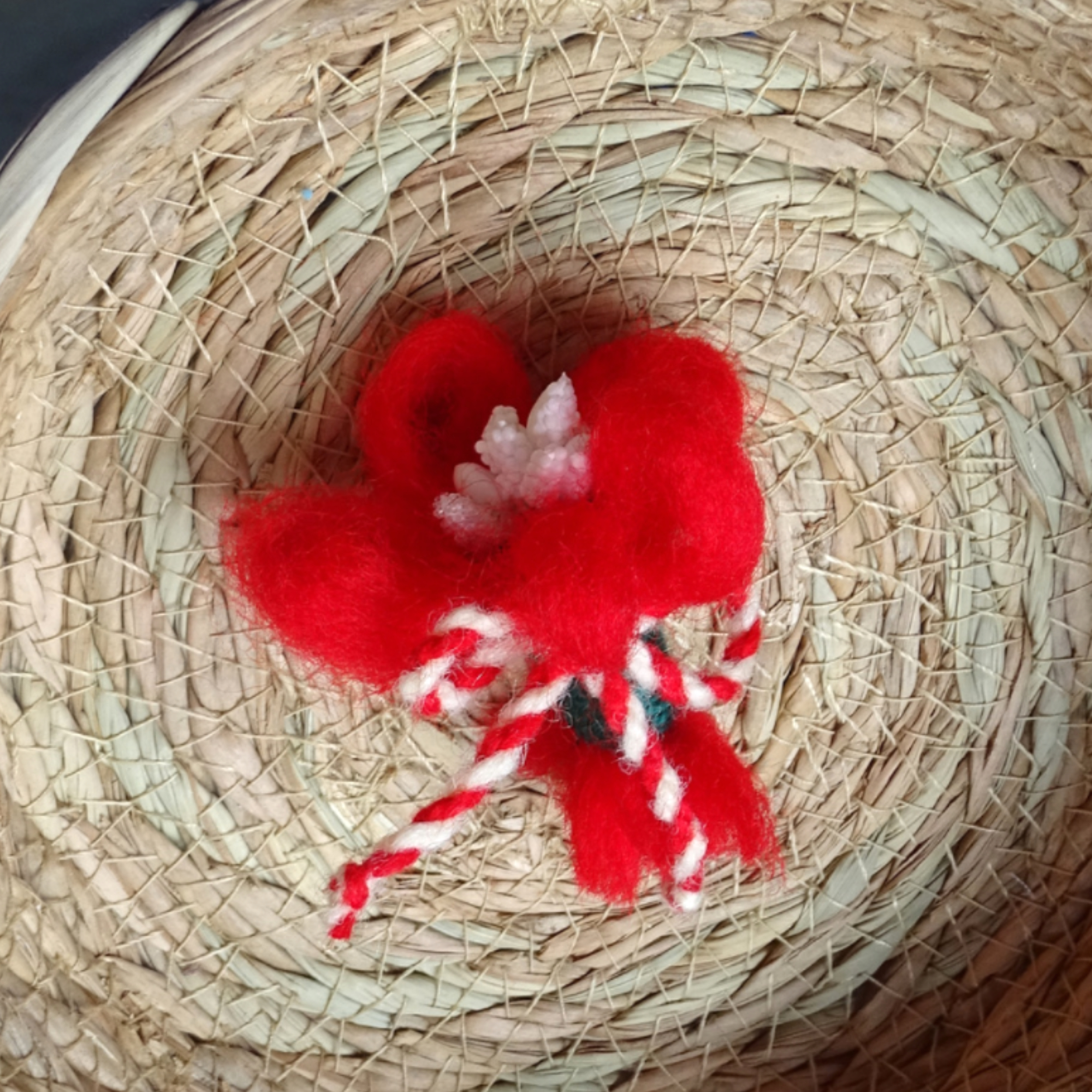 Тази мартеница е оформена като цвете и е изработена ръчно от вълна и прежда. Меката структура й придава обем и плътен вид, а декоративните елементи в центъра допълват формата по фин и ненатрапчив начин.